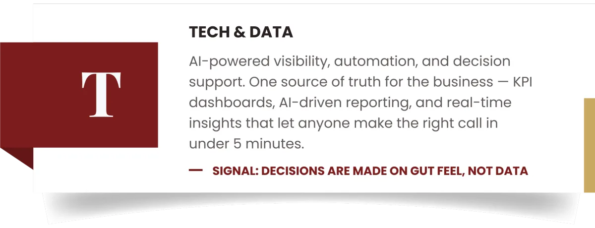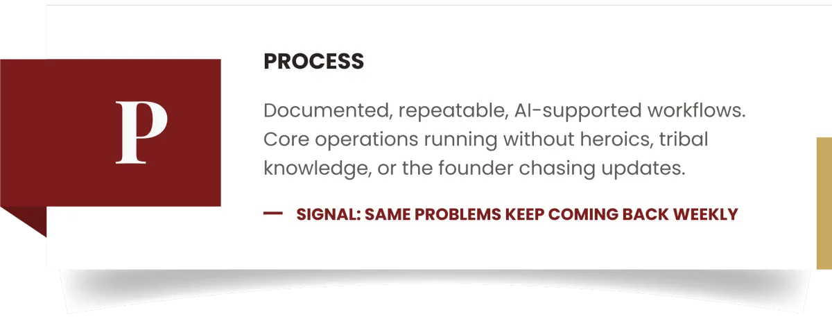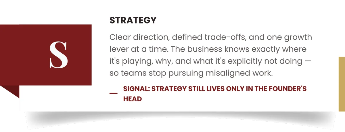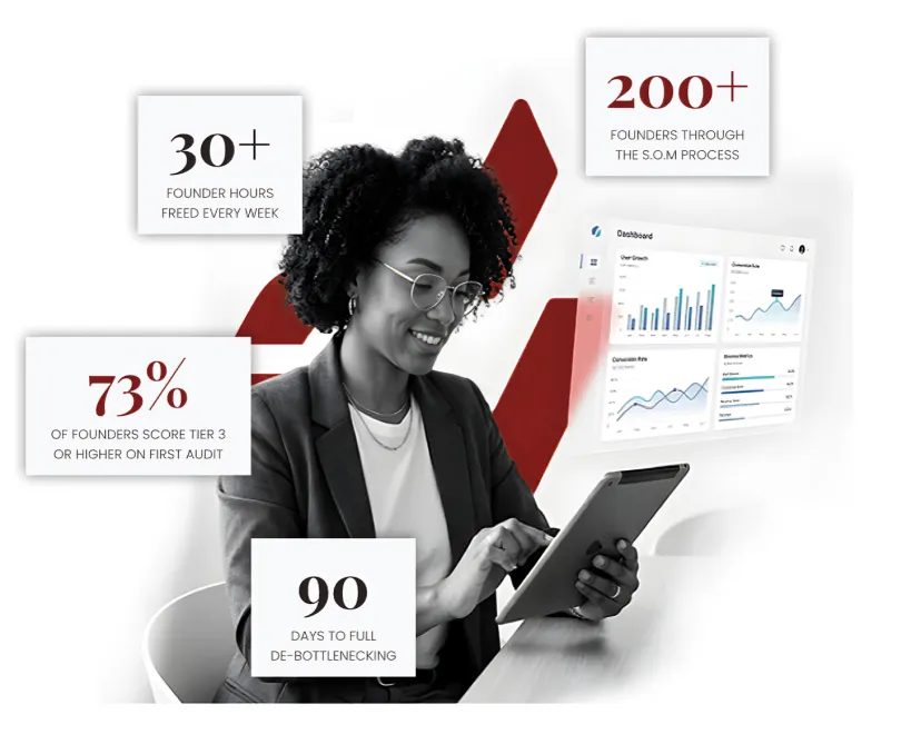 Most founders report meaningful daily workload relief within 14-30 days. Every S.O.M domain has defined 30/60/90-day success signals established before the engagement begins. By day 60, the founder should no longer be the daily escalation point - if they still are, we treat that as a failure and address it as such. By day 90, the operating system is installed, enforced, and running without the founder's constant presence.
